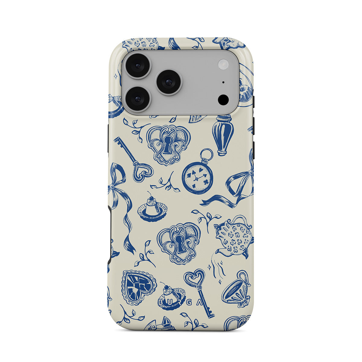このデザインの特徴ティーカップ、ティーポット、懐中時計、鍵、ハート、陶器、青と白の模様