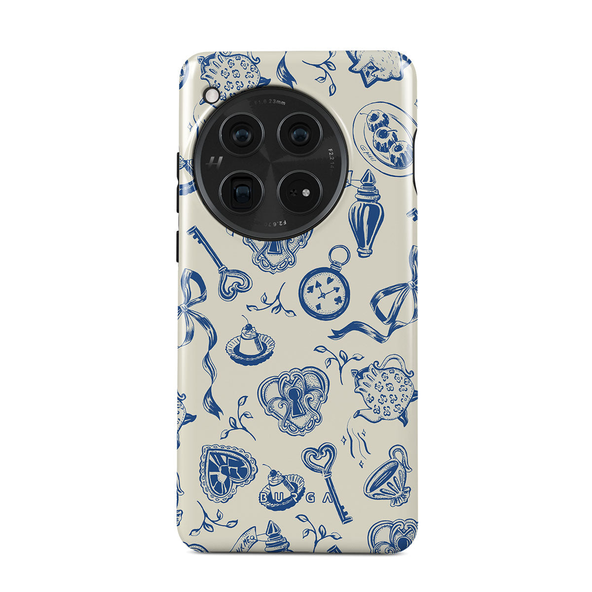 このデザインの特徴ティーカップ、ティーポット、懐中時計、鍵、ハート、陶器、青と白の模様