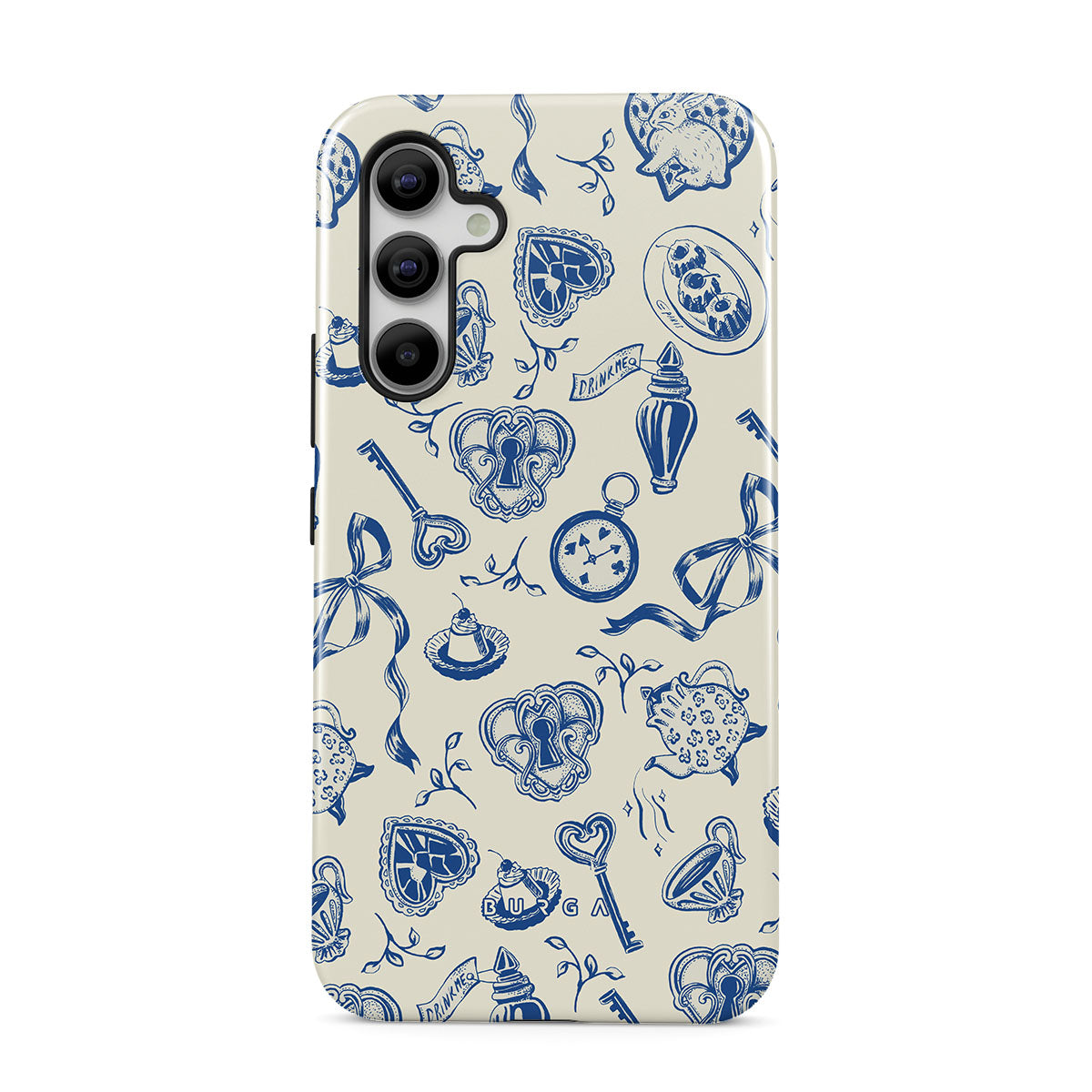 このデザインの特徴ティーカップ、ティーポット、懐中時計、鍵、ハート、陶器、青と白の模様