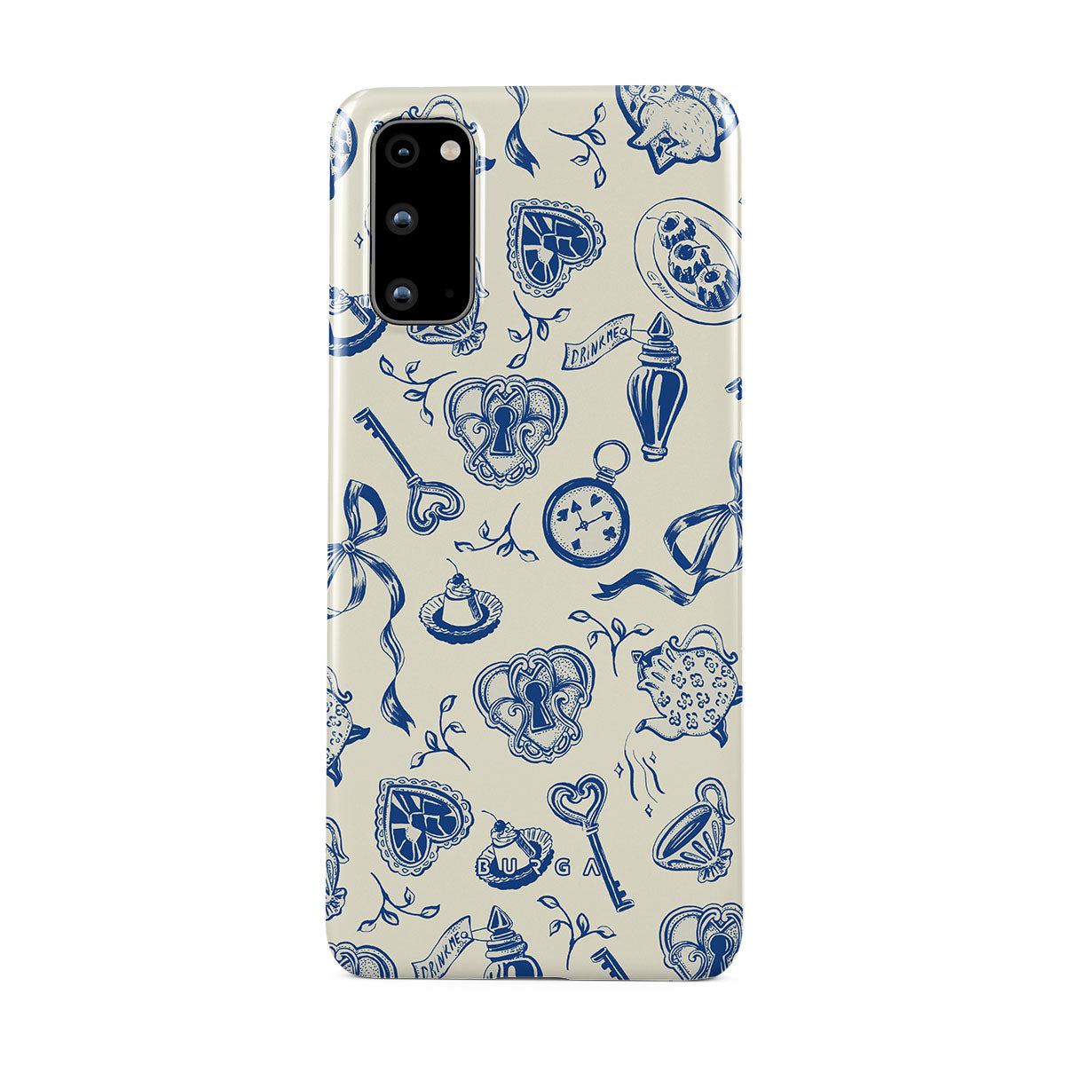 このデザインの特徴ティーカップ、ティーポット、懐中時計、鍵、ハート、陶器、青と白の模様