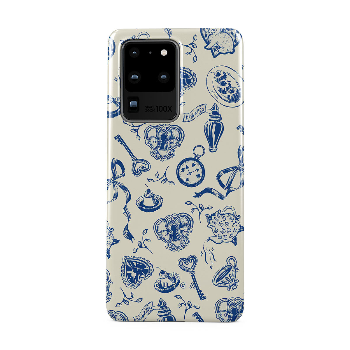このデザインの特徴ティーカップ、ティーポット、懐中時計、鍵、ハート、陶器、青と白の模様