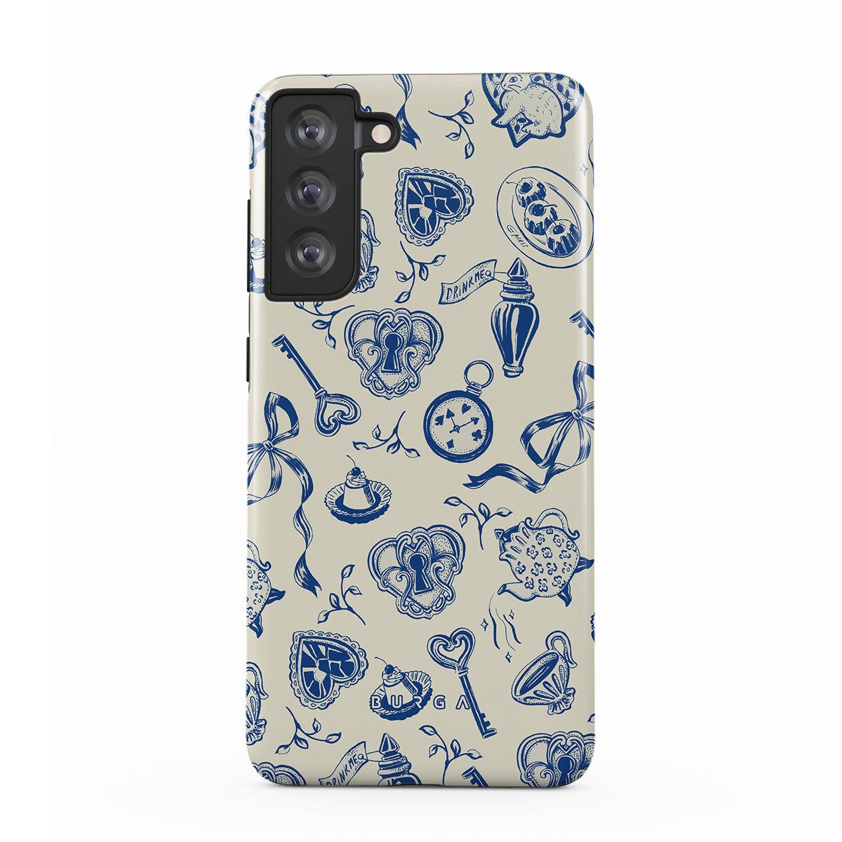 このデザインの特徴ティーカップ、ティーポット、懐中時計、鍵、ハート、陶器、青と白の模様