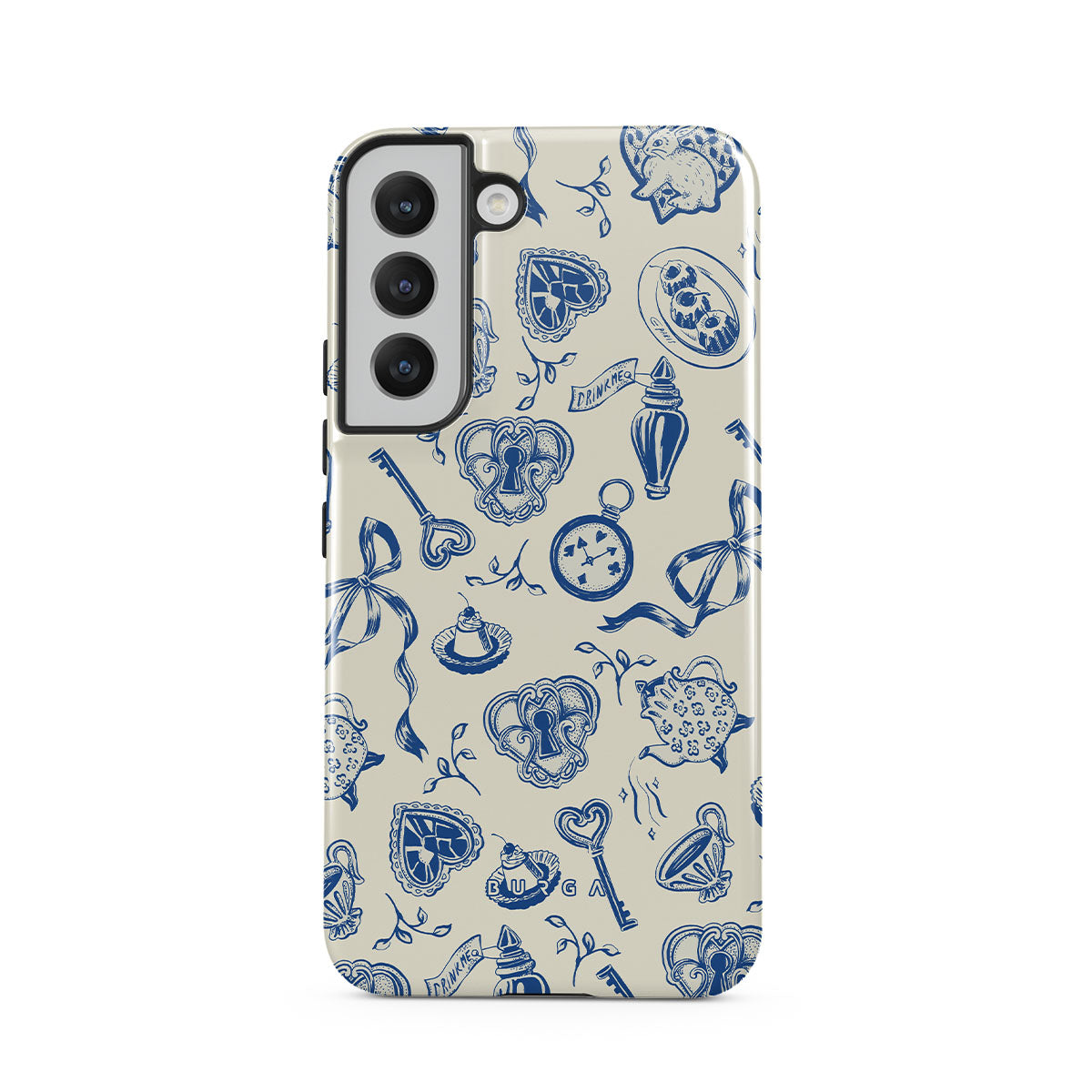 このデザインの特徴ティーカップ、ティーポット、懐中時計、鍵、ハート、陶器、青と白の模様