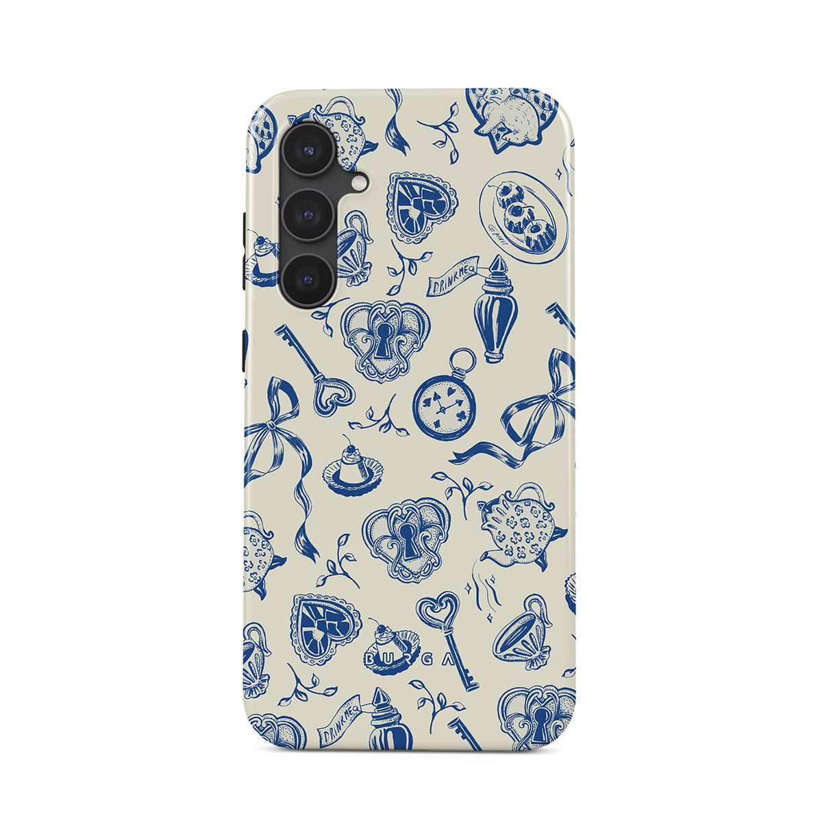 このデザインの特徴ティーカップ、ティーポット、懐中時計、鍵、ハート、陶器、青と白の模様