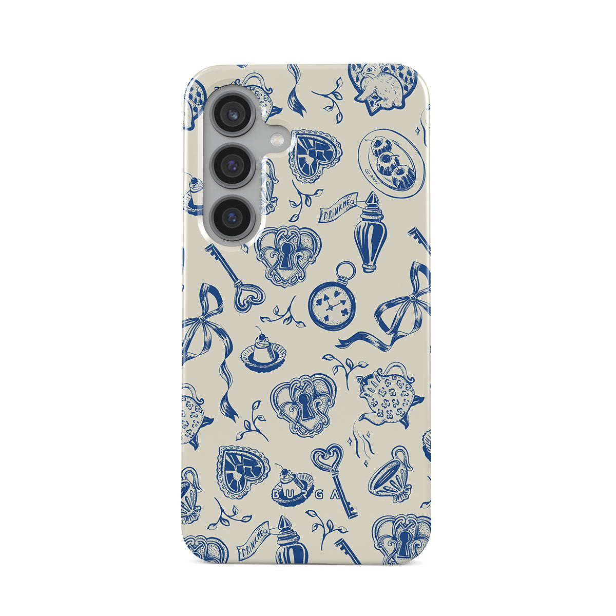 このデザインの特徴ティーカップ、ティーポット、懐中時計、鍵、ハート、陶器、青と白の模様
