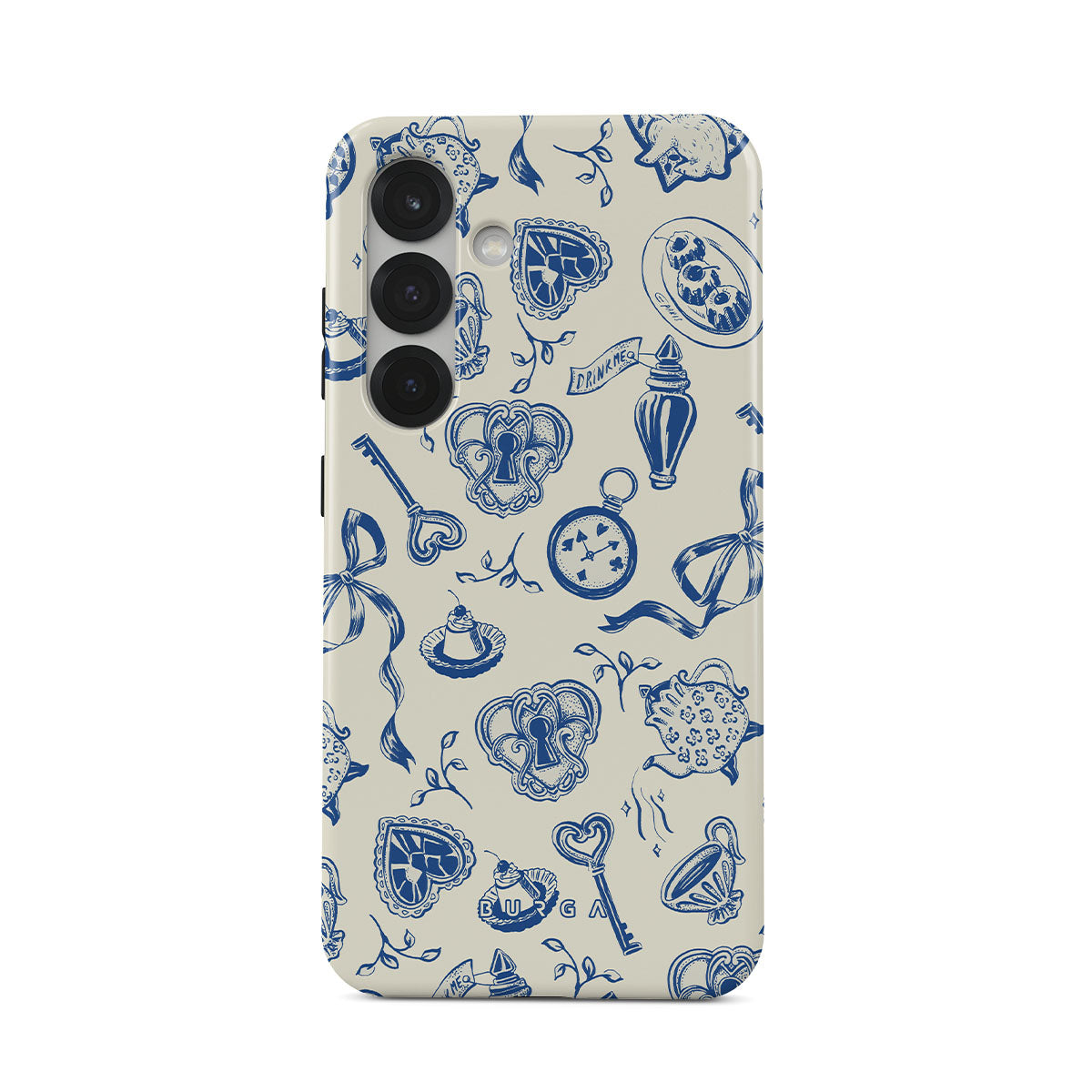 このデザインの特徴ティーカップ、ティーポット、懐中時計、鍵、ハート、陶器、青と白の模様