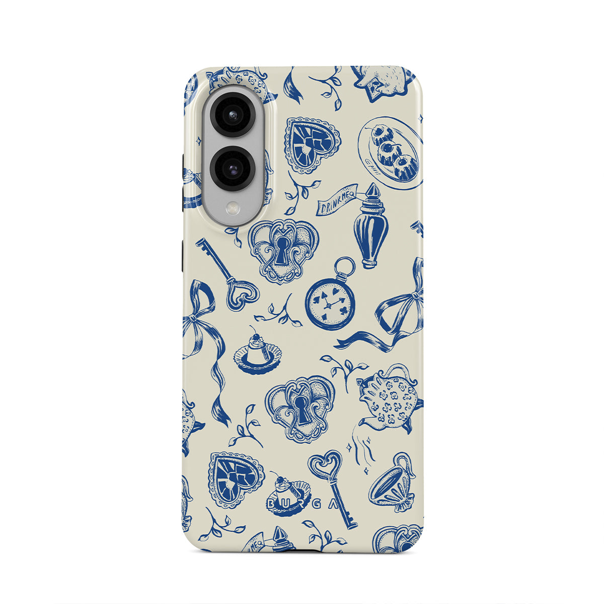 このデザインの特徴ティーカップ、ティーポット、懐中時計、鍵、ハート、陶器、青と白の模様