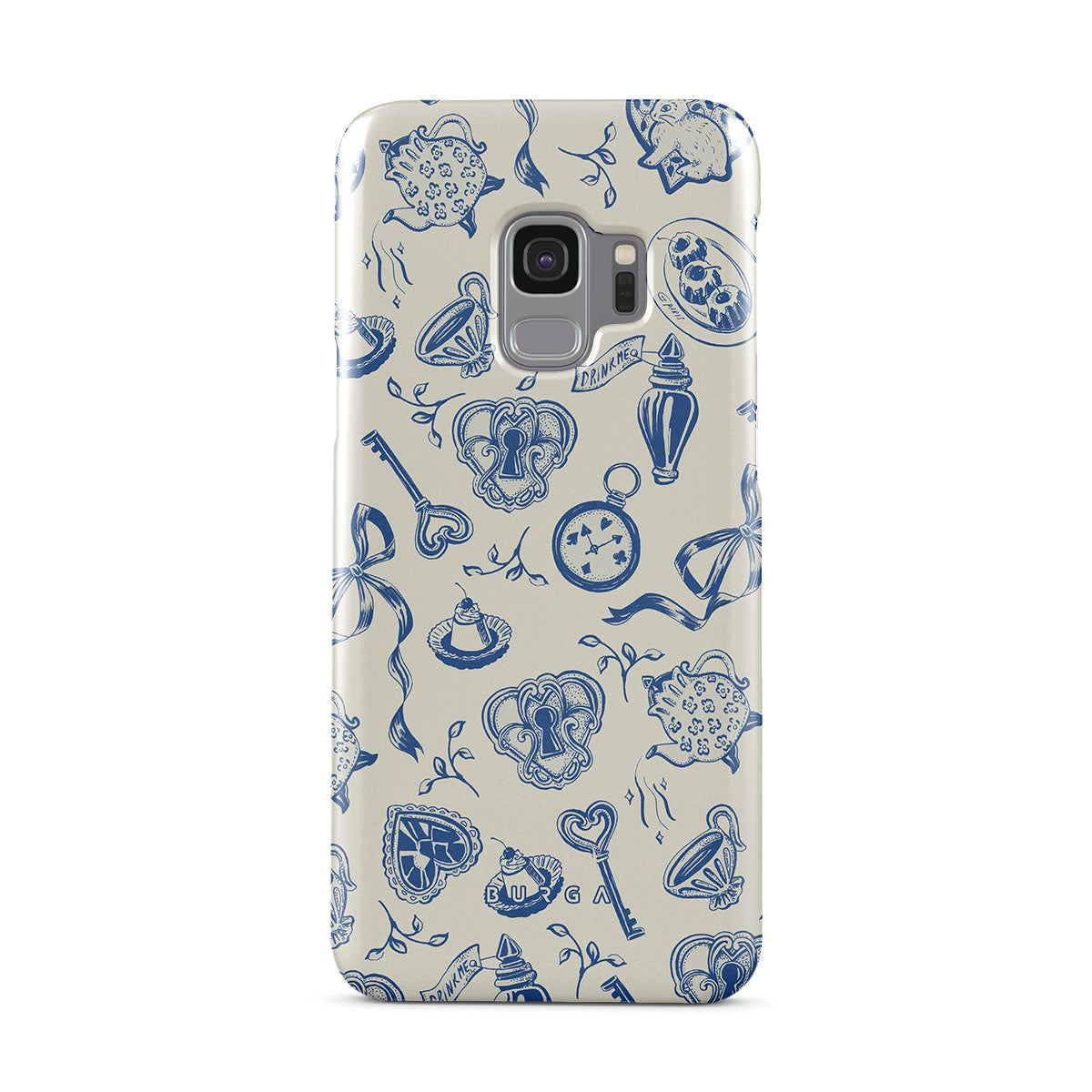 このデザインの特徴ティーカップ、ティーポット、懐中時計、鍵、ハート、陶器、青と白の模様