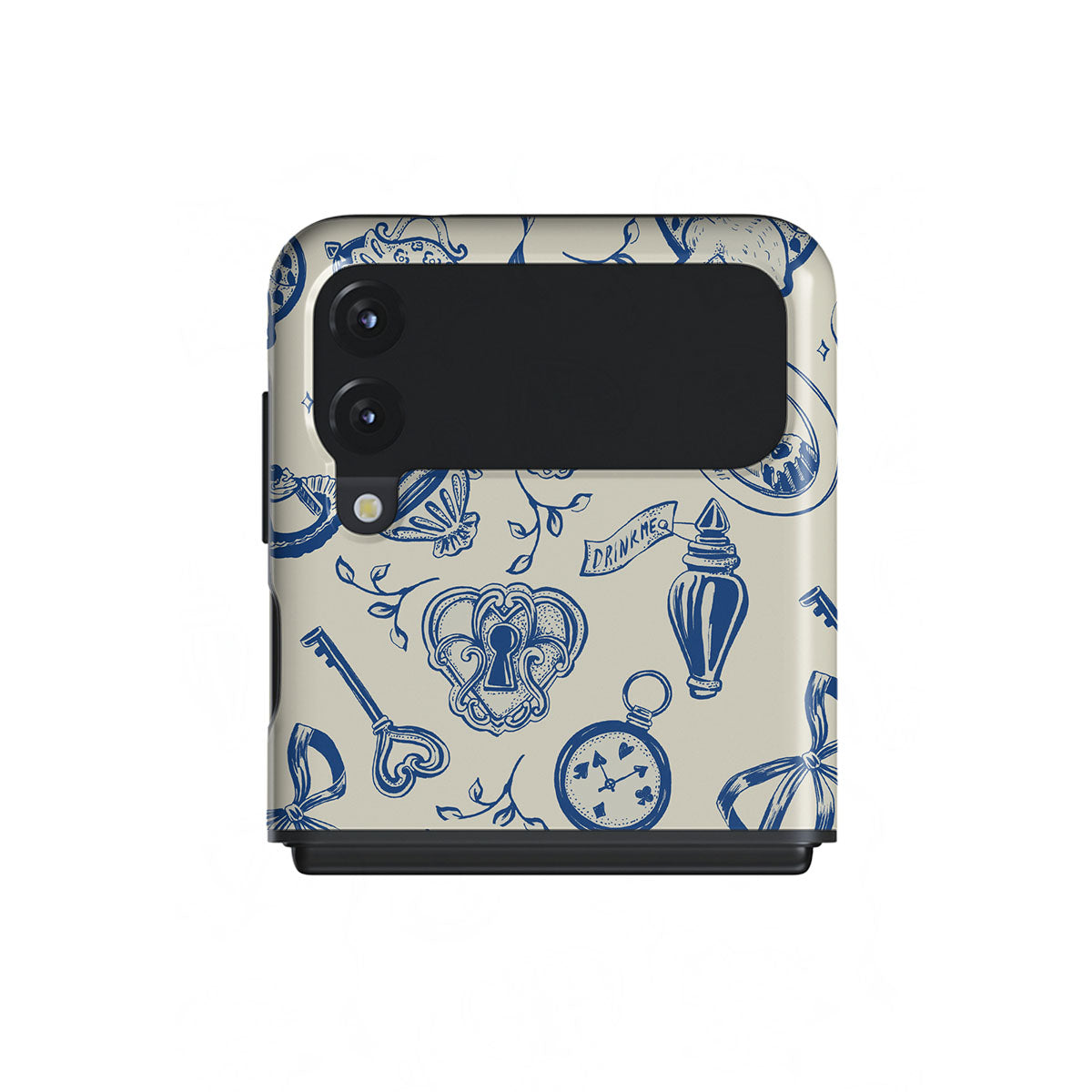 このデザインの特徴ティーカップ、ティーポット、懐中時計、鍵、ハート、陶器、青と白の模様
