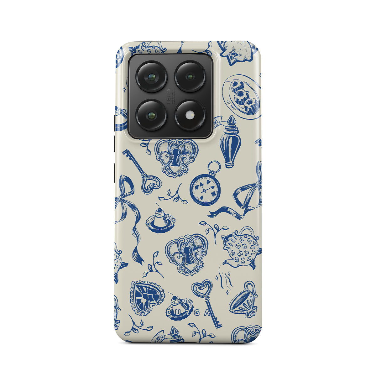 このデザインの特徴ティーカップ、ティーポット、懐中時計、鍵、ハート、陶器、青と白の模様