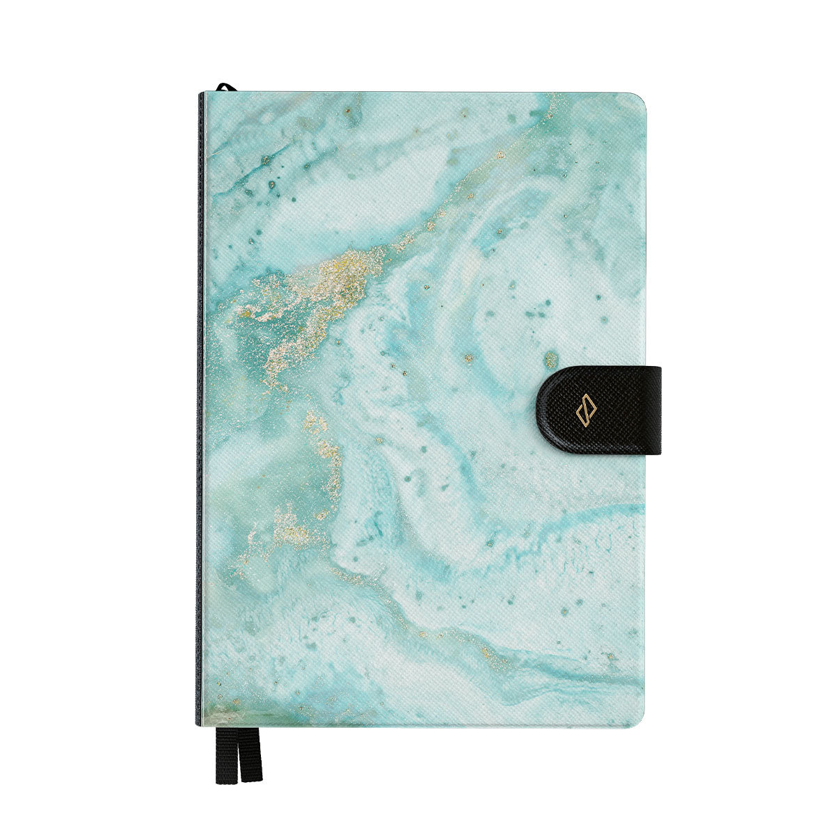 日付が書かれていないミニマリストなデザインで、手帳・スケジュール帳・ダイアリーとして使えます。表紙のハードカバーには、心地よい手触りのヴィーガンサフィアーノレザーを使用。スリムな磁気べえると付きの頑丈な手帳で、コーヒーをこぼしたり、うっかり手帳を落としたりしても安心です。