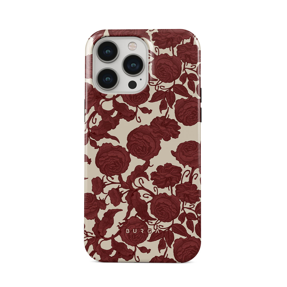 このデザインの特徴は、ダークレッドのバラ、複雑に絡み合ったフローラルパターン、ヴィンテージな模様。