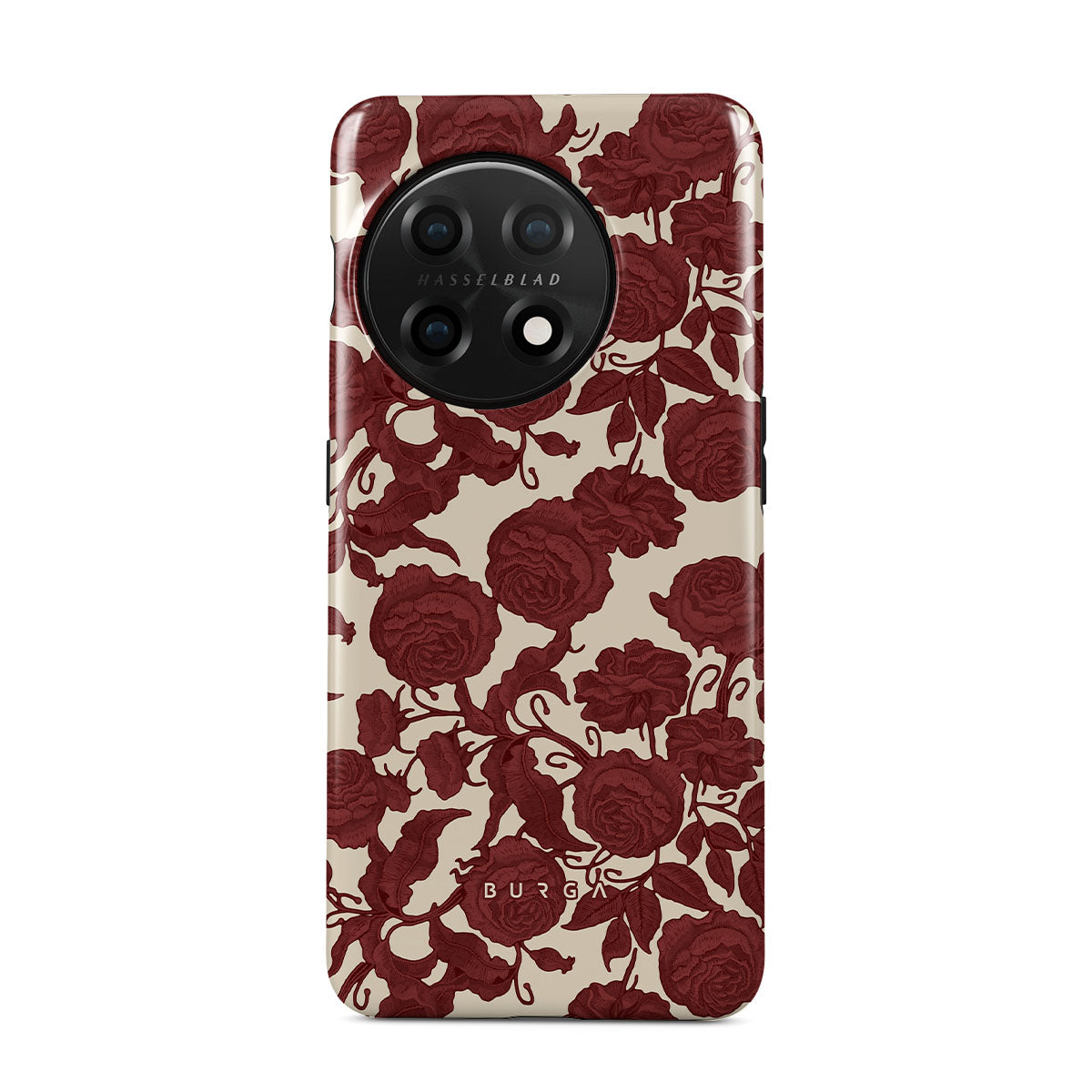このデザインの特徴は、ダークレッドのバラ、複雑に絡み合ったフローラルパターン、ヴィンテージな模様。