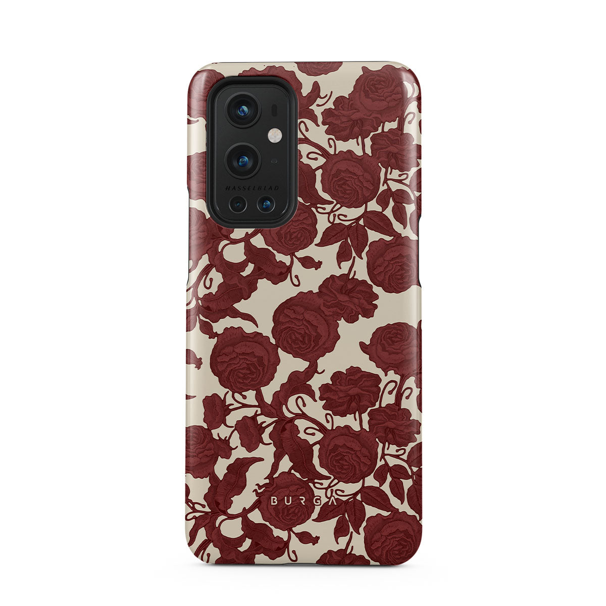 このデザインの特徴は、ダークレッドのバラ、複雑に絡み合ったフローラルパターン、ヴィンテージな模様。