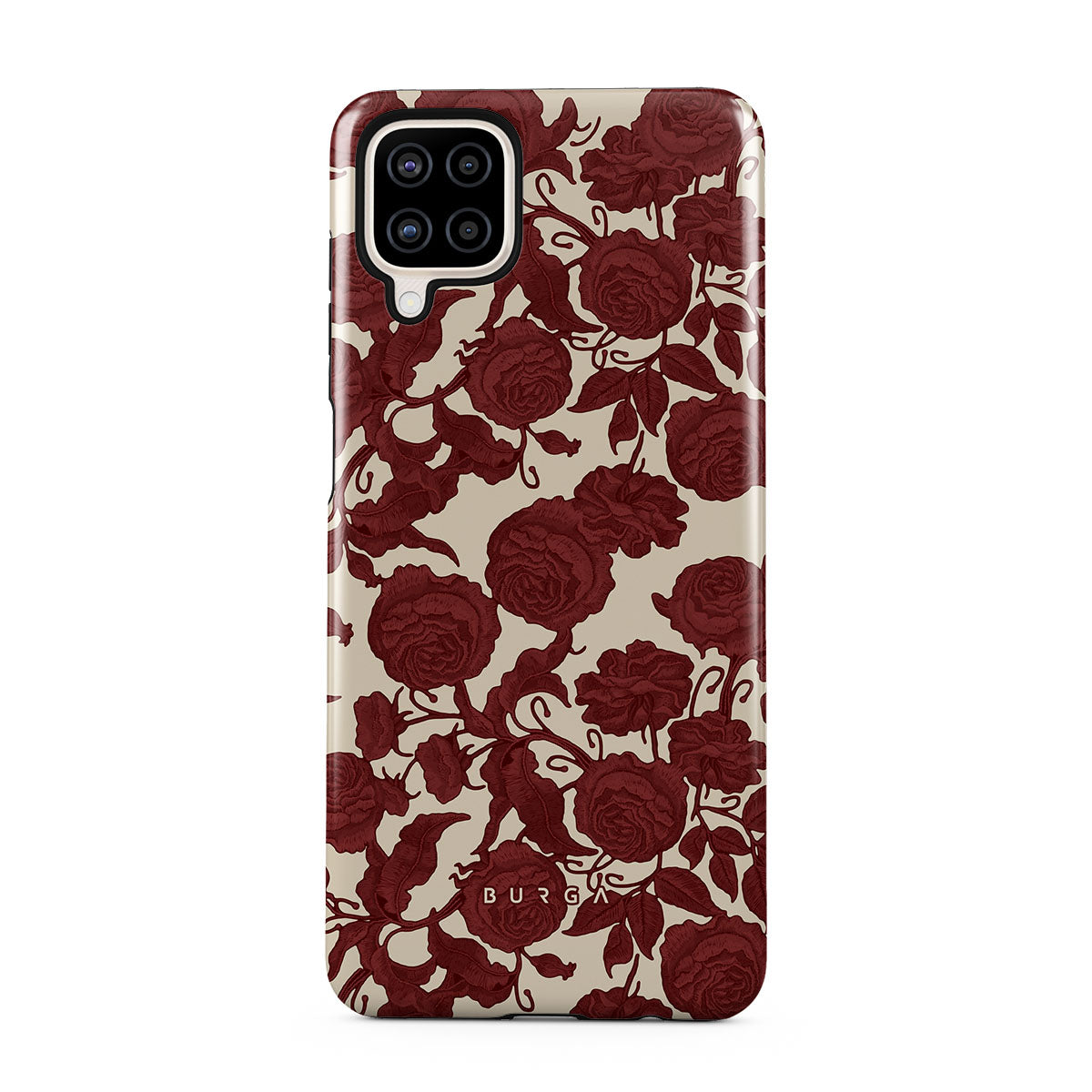 このデザインの特徴は、ダークレッドのバラ、複雑に絡み合ったフローラルパターン、ヴィンテージな模様。