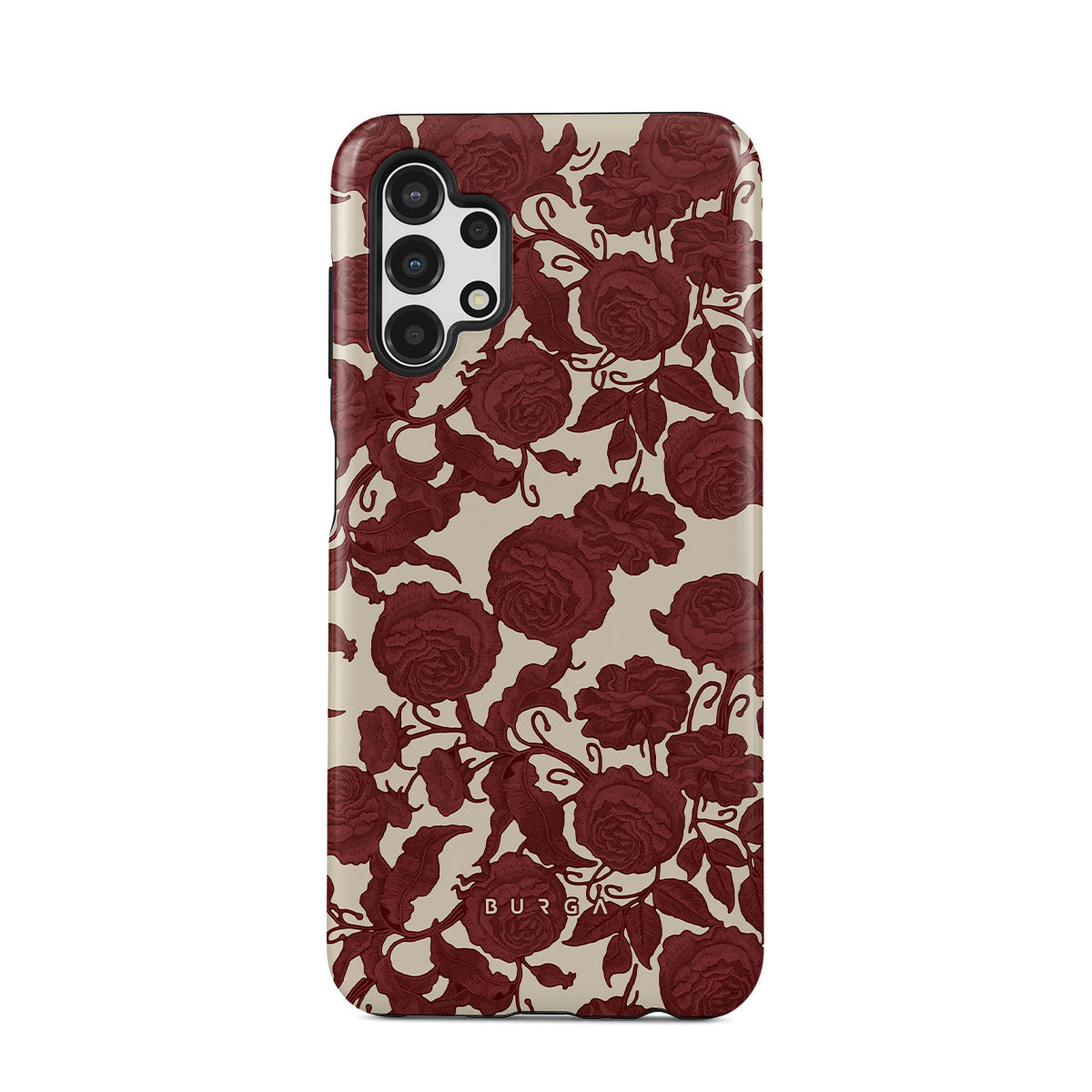このデザインの特徴は、ダークレッドのバラ、複雑に絡み合ったフローラルパターン、ヴィンテージな模様。