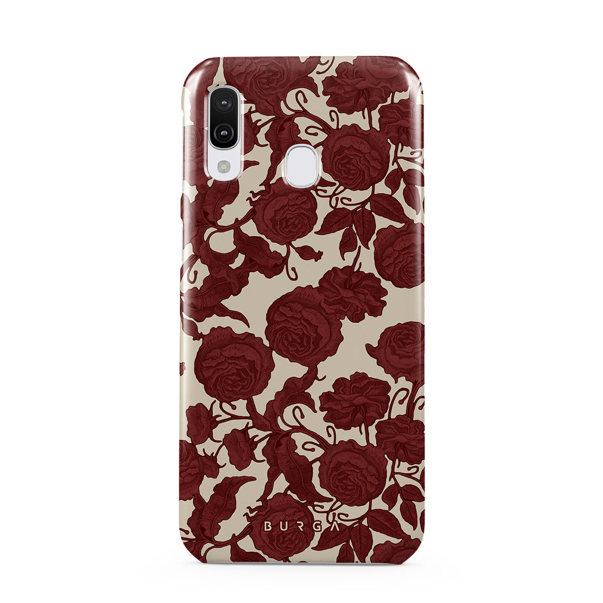 このデザインの特徴は、ダークレッドのバラ、複雑に絡み合ったフローラルパターン、ヴィンテージな模様。