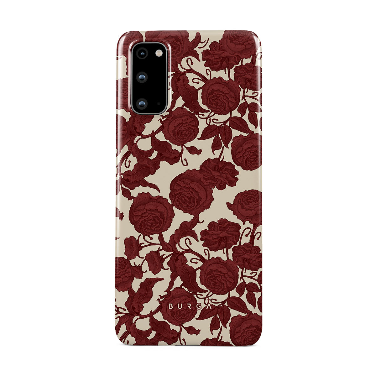 このデザインの特徴は、ダークレッドのバラ、複雑に絡み合ったフローラルパターン、ヴィンテージな模様。