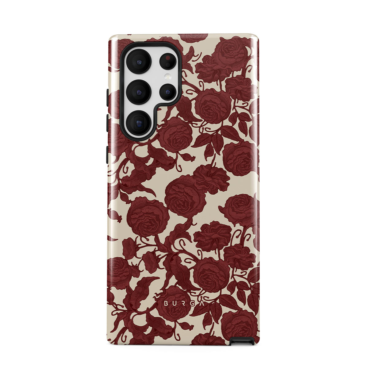 このデザインの特徴は、ダークレッドのバラ、複雑に絡み合ったフローラルパターン、ヴィンテージな模様。