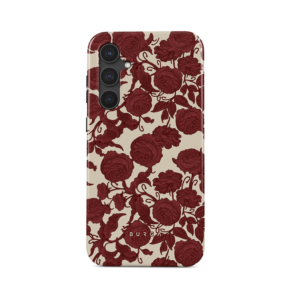 このデザインの特徴は、ダークレッドのバラ、複雑に絡み合ったフローラルパターン、ヴィンテージな模様。