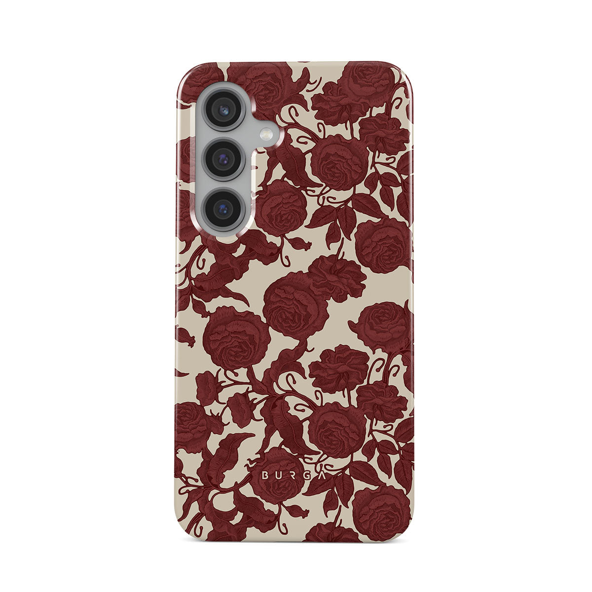 このデザインの特徴は、ダークレッドのバラ、複雑に絡み合ったフローラルパターン、ヴィンテージな模様。