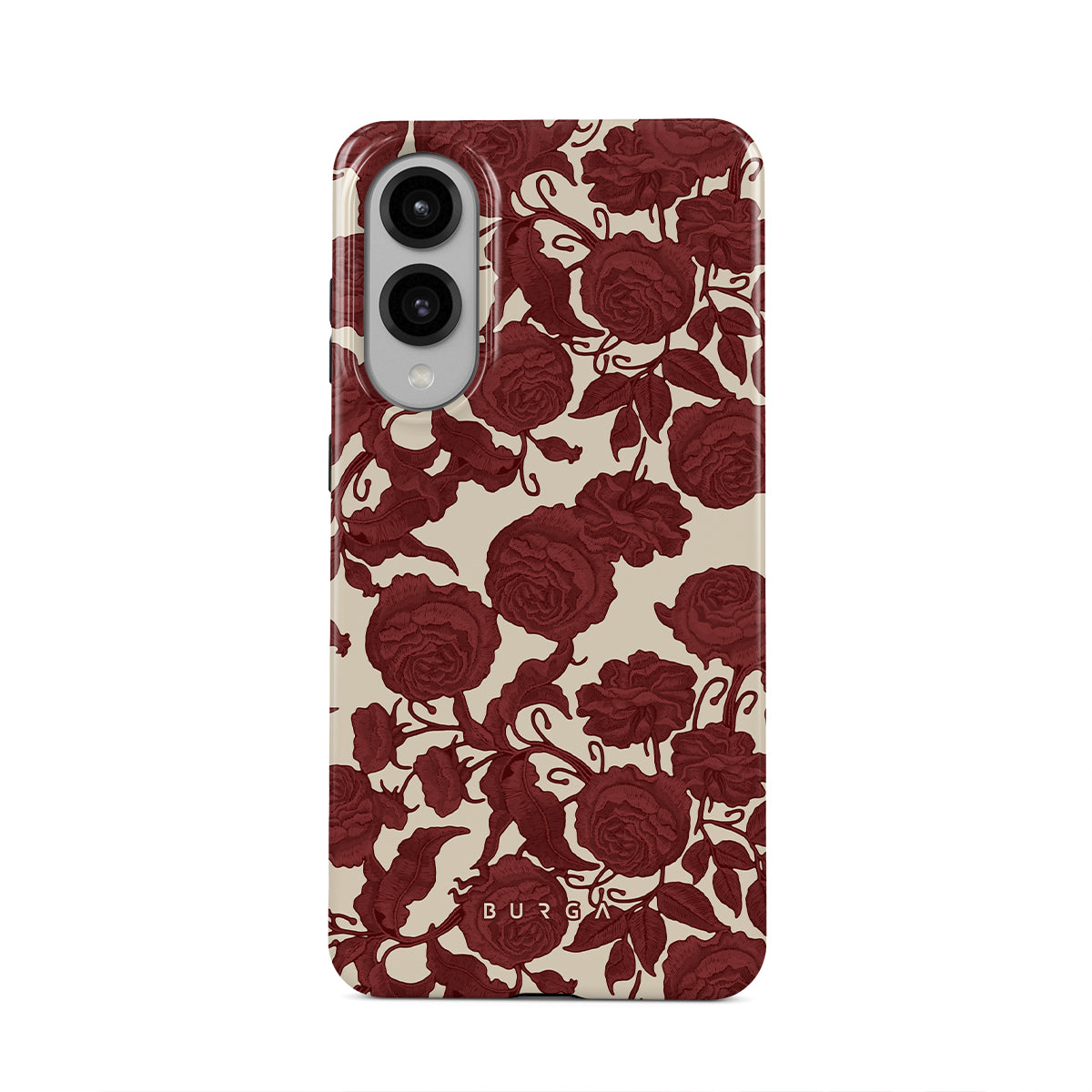 このデザインの特徴は、ダークレッドのバラ、複雑に絡み合ったフローラルパターン、ヴィンテージな模様。