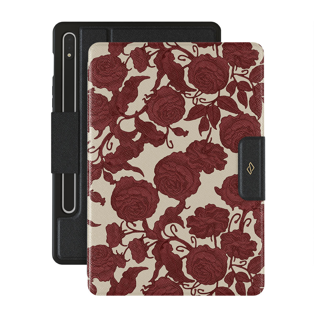このデザインの特徴は、ダークレッドのバラ、複雑に絡み合ったフローラルパターン、ヴィンテージな模様。