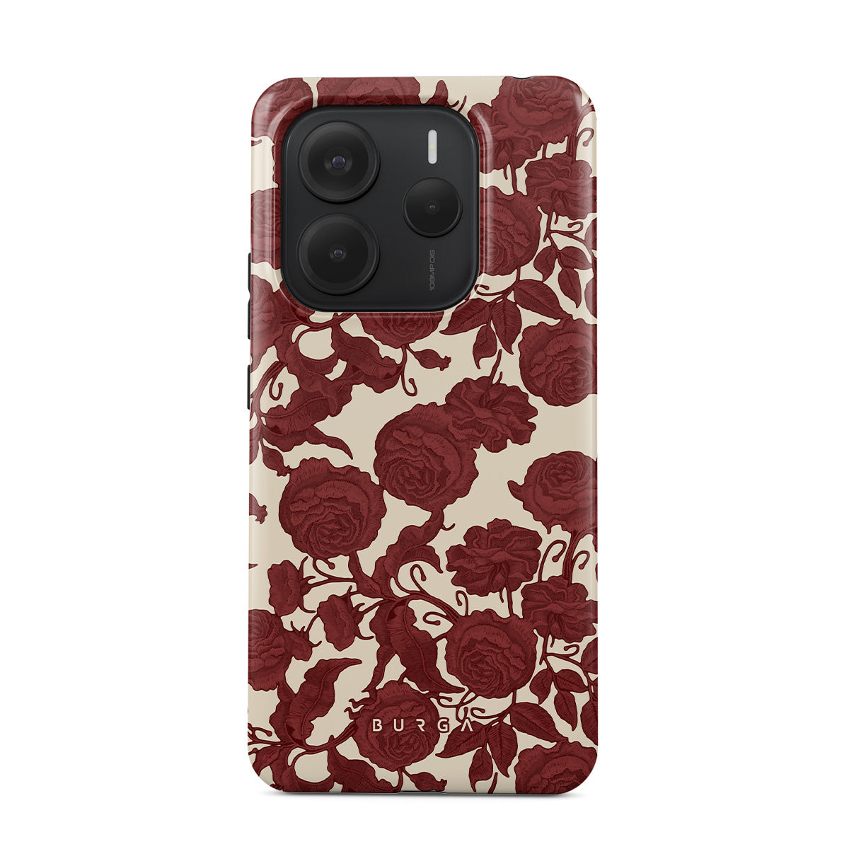 このデザインの特徴は、ダークレッドのバラ、複雑に絡み合ったフローラルパターン、ヴィンテージな模様。