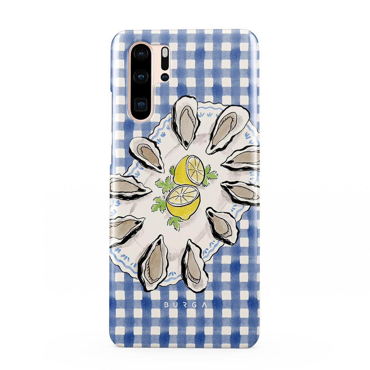 このデザインの特徴カキ、レモン、青いギンガム、フレッシュなコースタル要素、柔らかいパステルトーンが含まれています