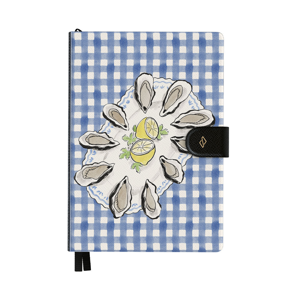 このデザインの特徴カキ、レモン、青いギンガム、フレッシュなコースタル要素、柔らかいパステルトーンが含まれています