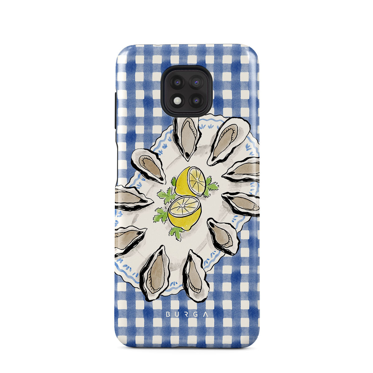 このデザインの特徴カキ、レモン、青いギンガム、フレッシュなコースタル要素、柔らかいパステルトーンが含まれています