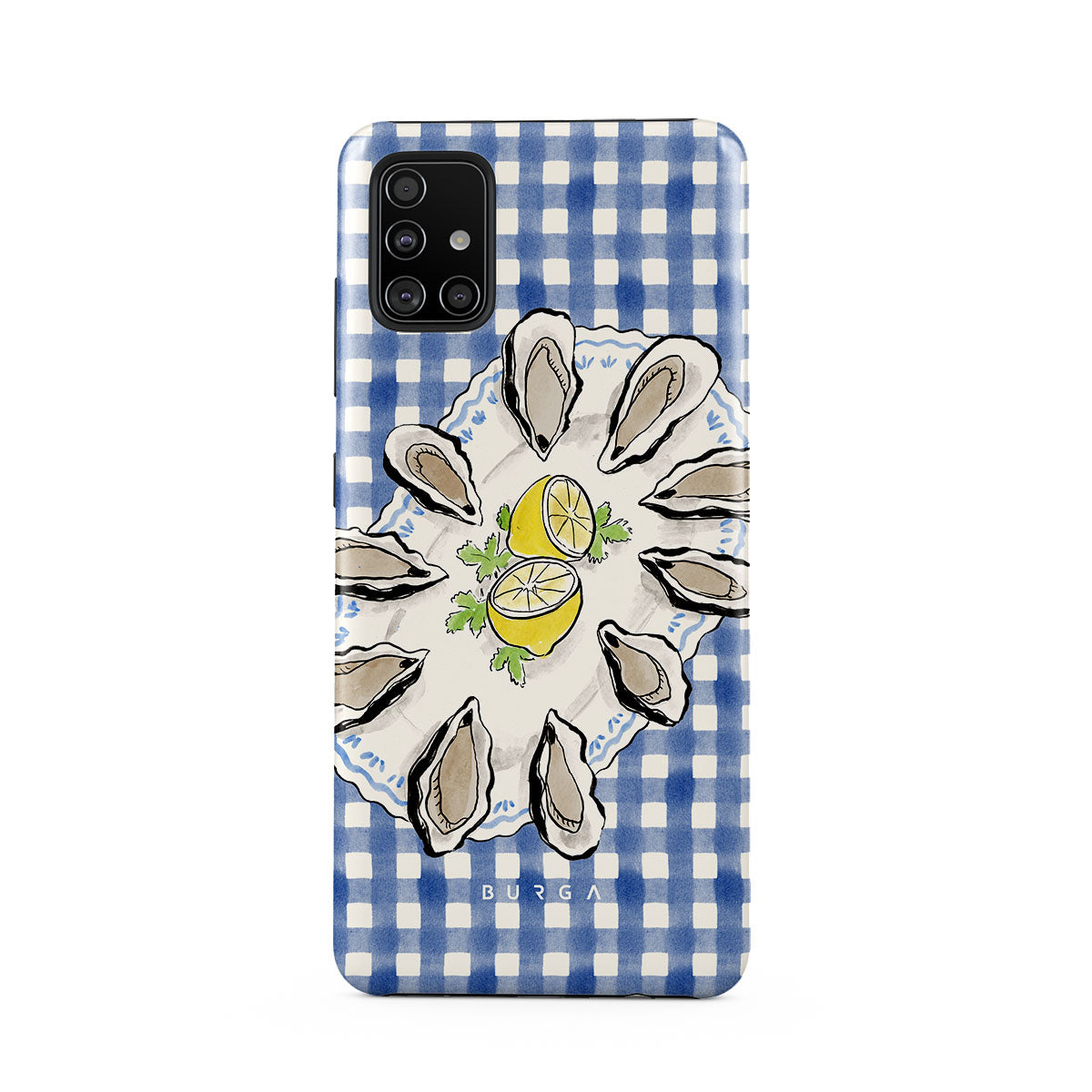 このデザインの特徴カキ、レモン、青いギンガム、フレッシュなコースタル要素、柔らかいパステルトーンが含まれています