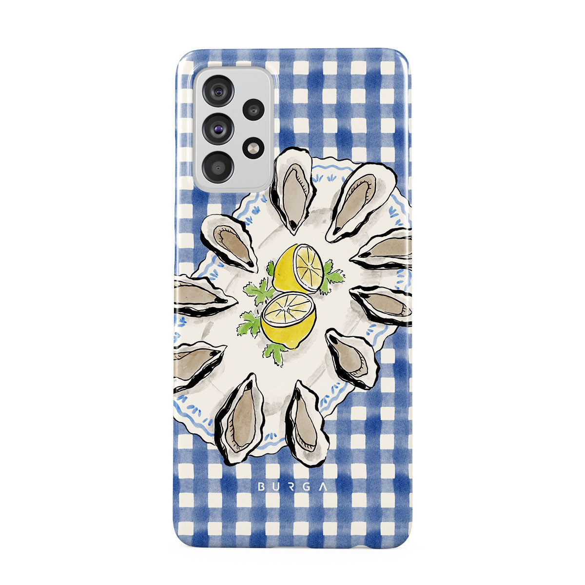 このデザインの特徴カキ、レモン、青いギンガム、フレッシュなコースタル要素、柔らかいパステルトーンが含まれています