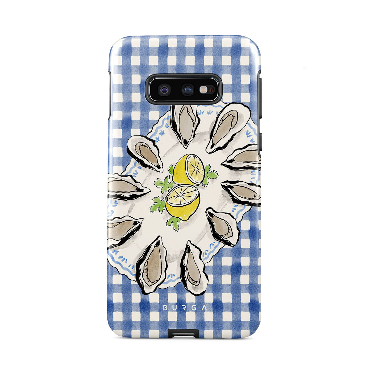 このデザインの特徴カキ、レモン、青いギンガム、フレッシュなコースタル要素、柔らかいパステルトーンが含まれています