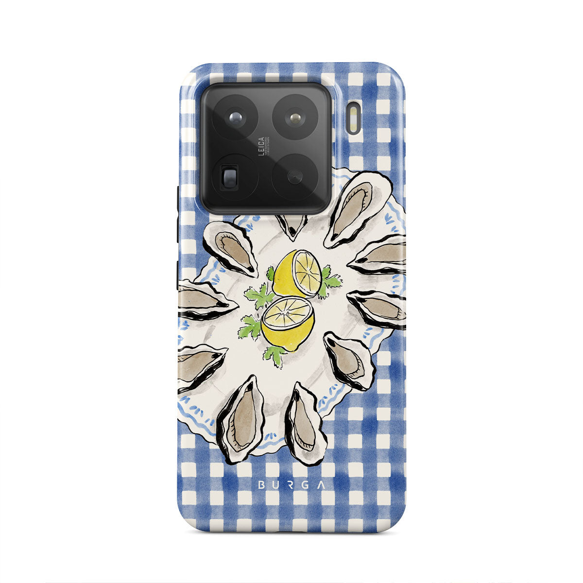 このデザインの特徴カキ、レモン、青いギンガム、フレッシュなコースタル要素、柔らかいパステルトーンが含まれています