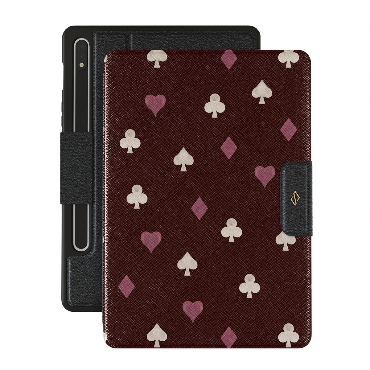 このデザインの特徴トランプのスート(ハート、スペード、ダイヤ、クラブ)、ボルドー色の背景