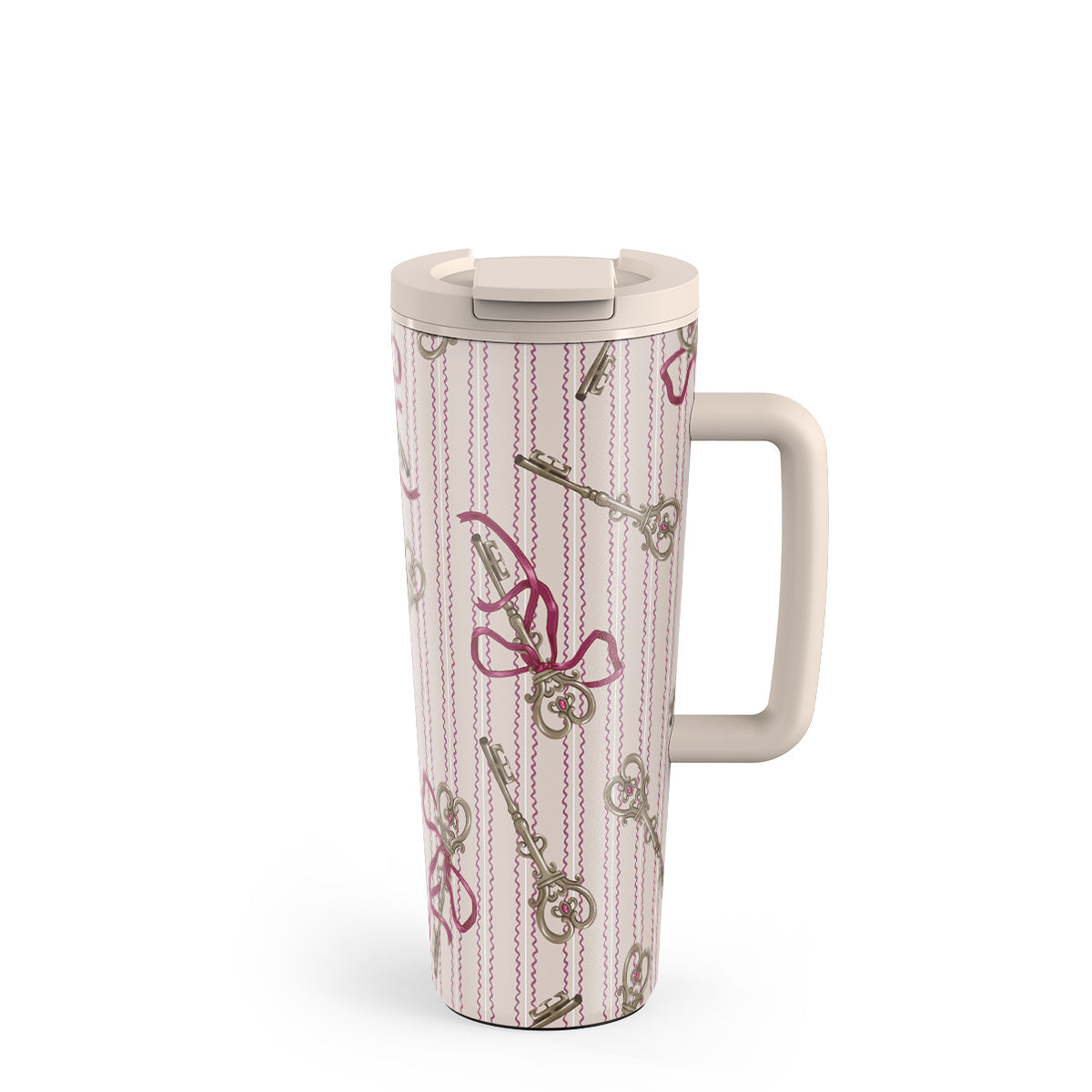 このデザインの特徴アンティークキー、リボン、ピンクのリボン、ストライプの背景