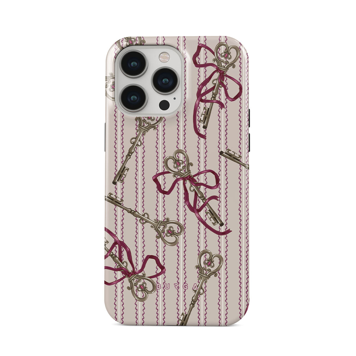 このデザインの特徴アンティークキー、リボン、ピンクのリボン、ストライプの背景