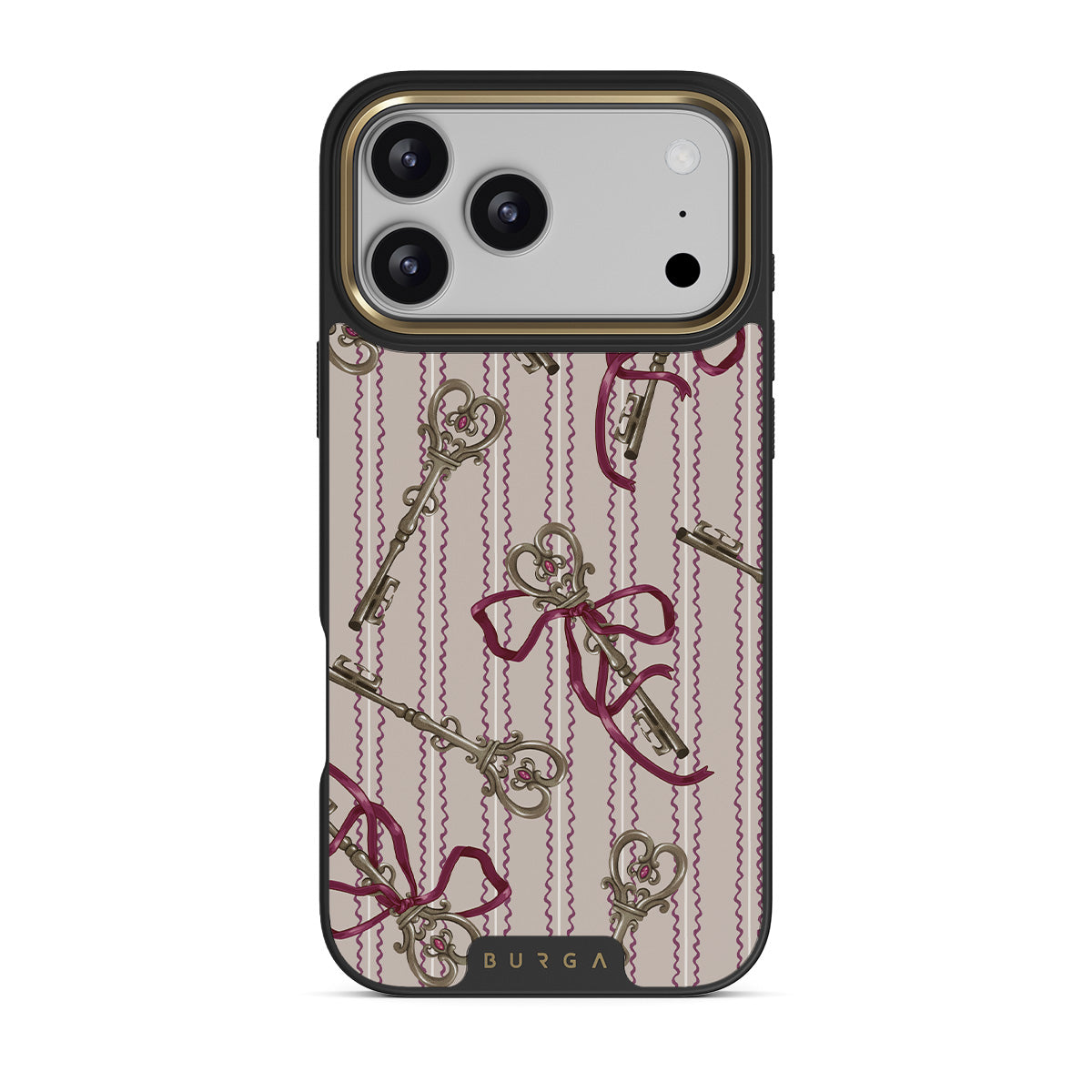 このデザインの特徴アンティークキー、リボン、ピンクのリボン、ストライプの背景