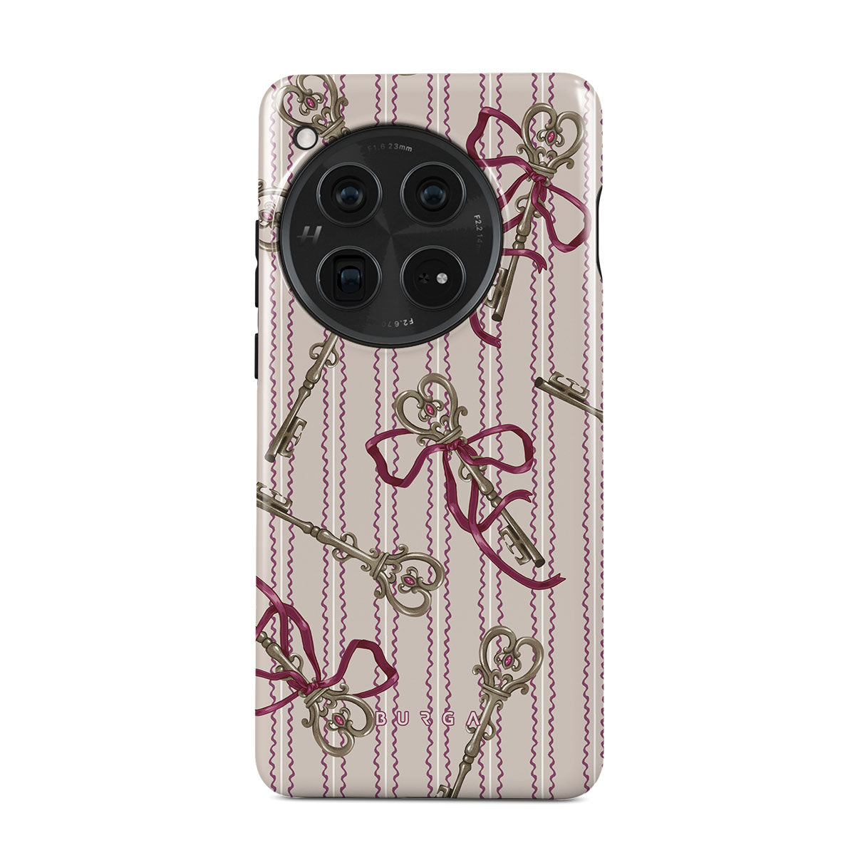 このデザインの特徴アンティークキー、リボン、ピンクのリボン、ストライプの背景