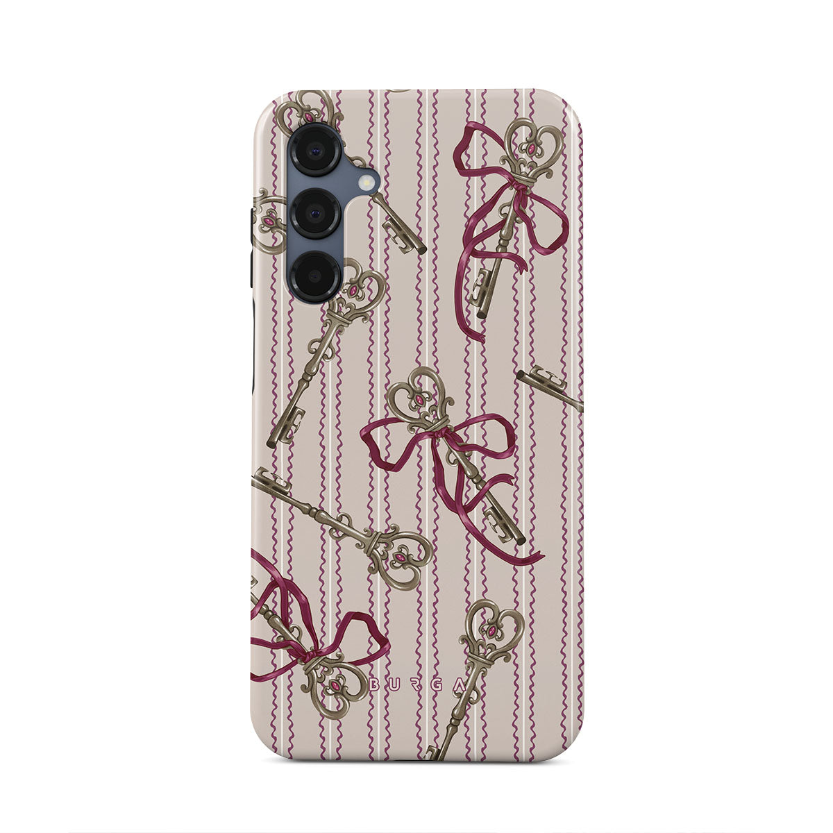 このデザインの特徴アンティークキー、リボン、ピンクのリボン、ストライプの背景