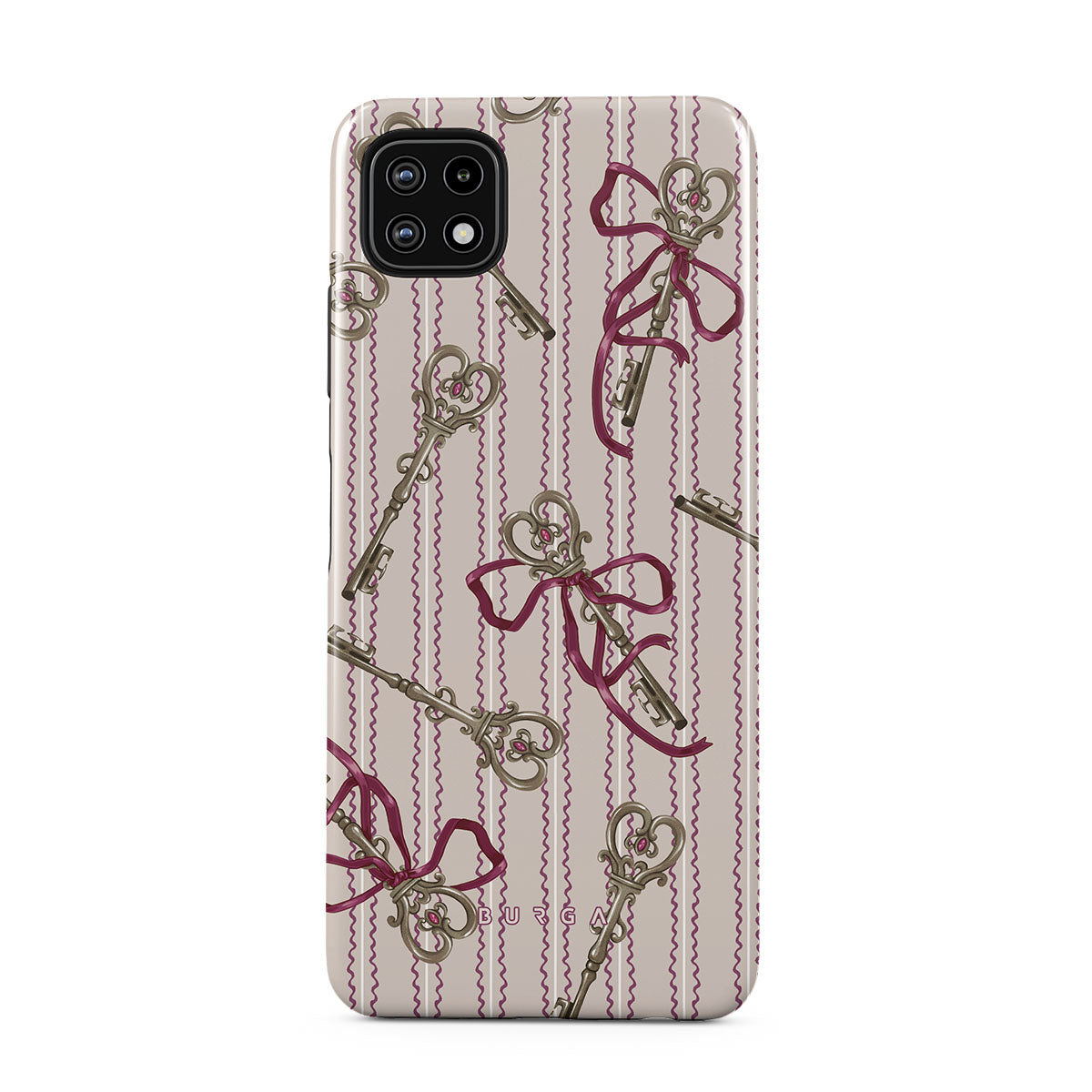 このデザインの特徴アンティークキー、リボン、ピンクのリボン、ストライプの背景