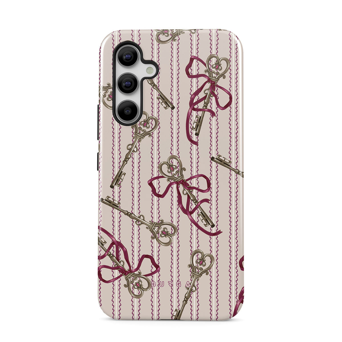 このデザインの特徴アンティークキー、リボン、ピンクのリボン、ストライプの背景