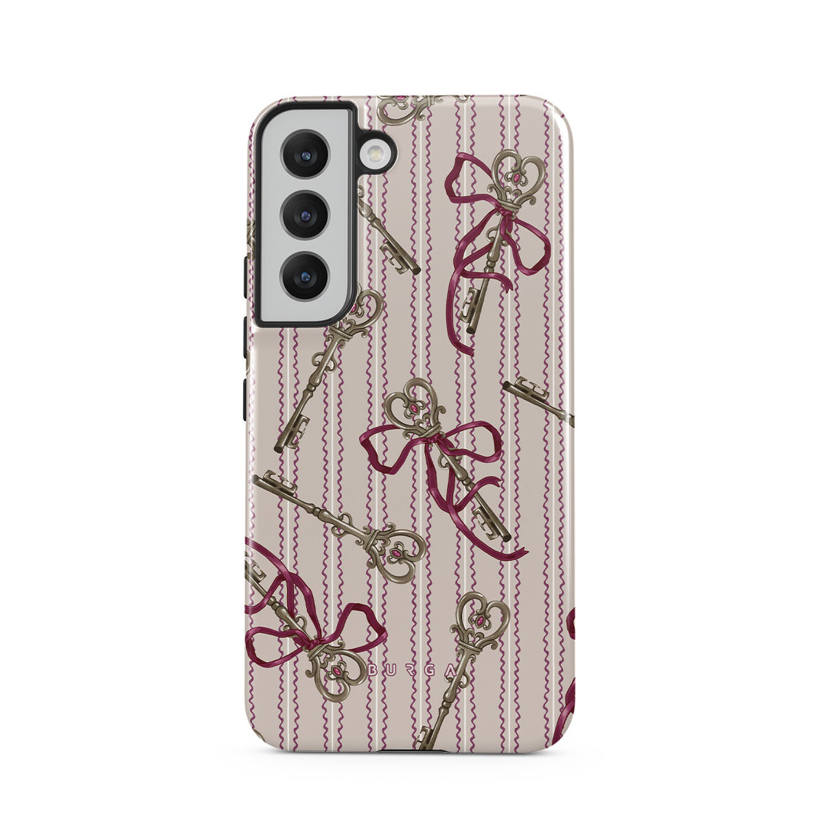 このデザインの特徴アンティークキー、リボン、ピンクのリボン、ストライプの背景