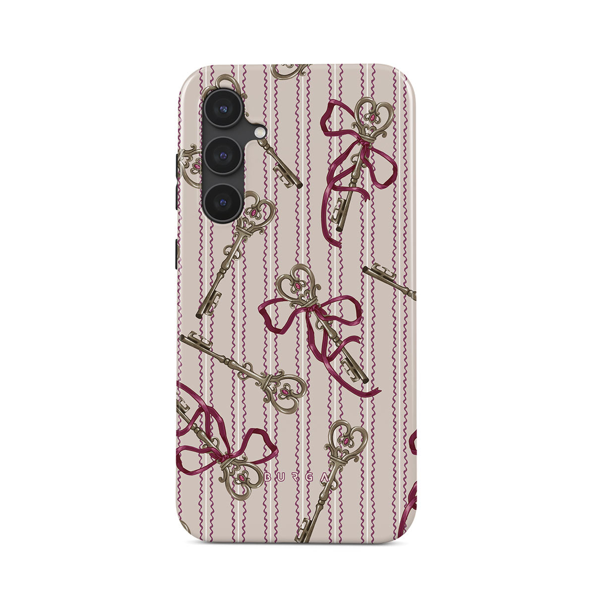 このデザインの特徴アンティークキー、リボン、ピンクのリボン、ストライプの背景