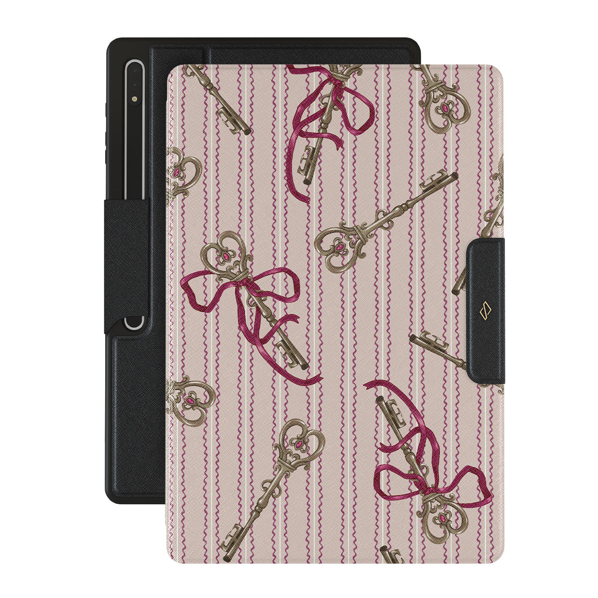 このデザインの特徴アンティークキー、リボン、ピンクのリボン、ストライプの背景