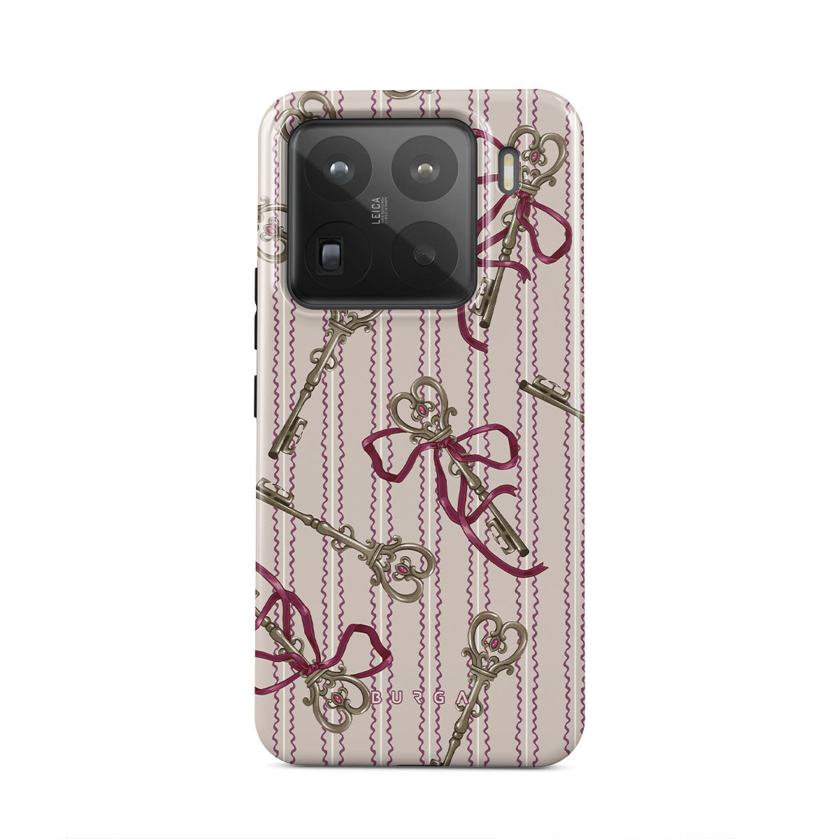 このデザインの特徴アンティークキー、リボン、ピンクのリボン、ストライプの背景