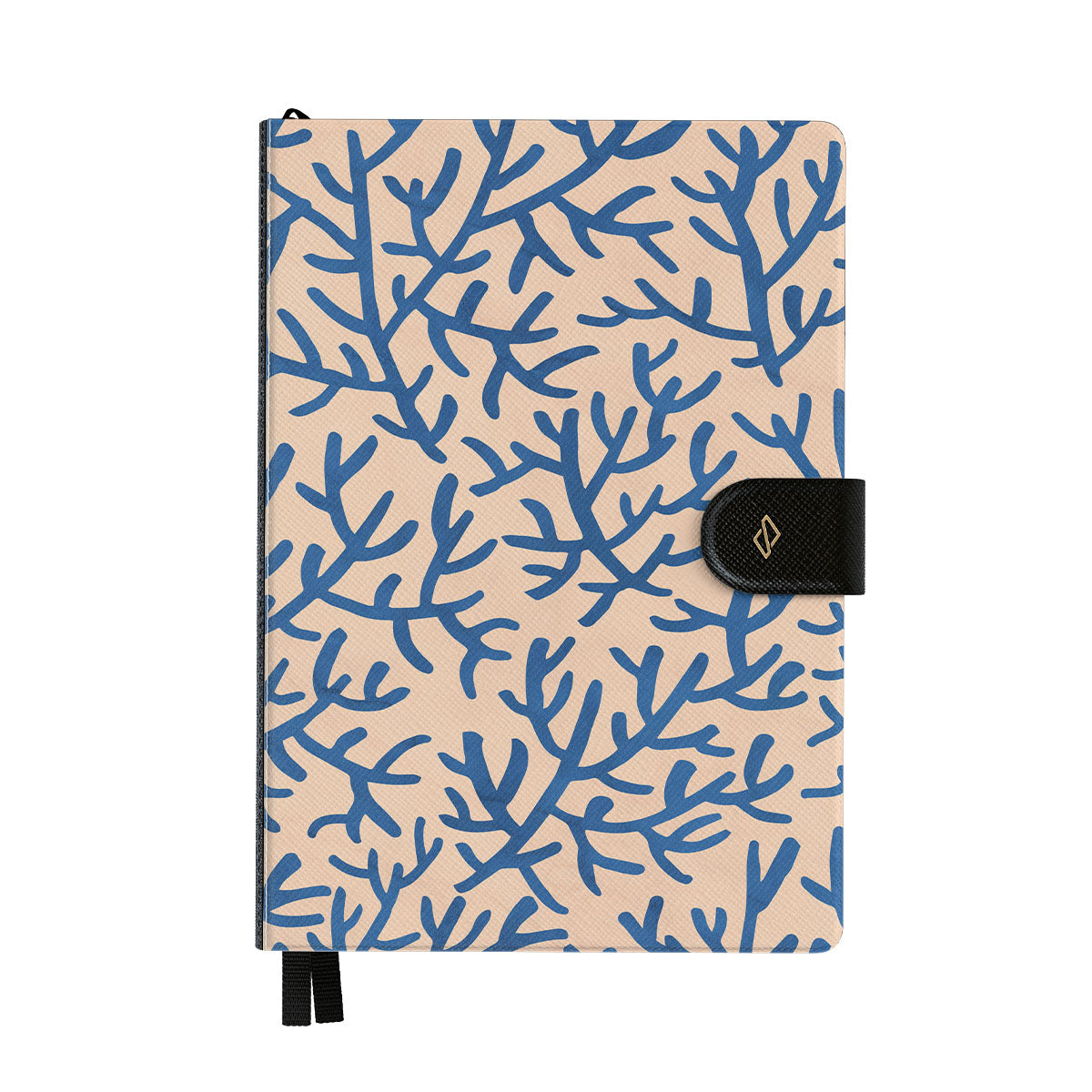 日付が書かれていないミニマリストなデザインで、手帳・スケジュール帳・ダイアリーとして使えます。表紙のハードカバーには、心地よい手触りのヴィーガンサフィアーノレザーを使用。スリムな磁気べえると付きの頑丈な手帳で、コーヒーをこぼしたり、うっかり手帳を落としたりしても安心です。