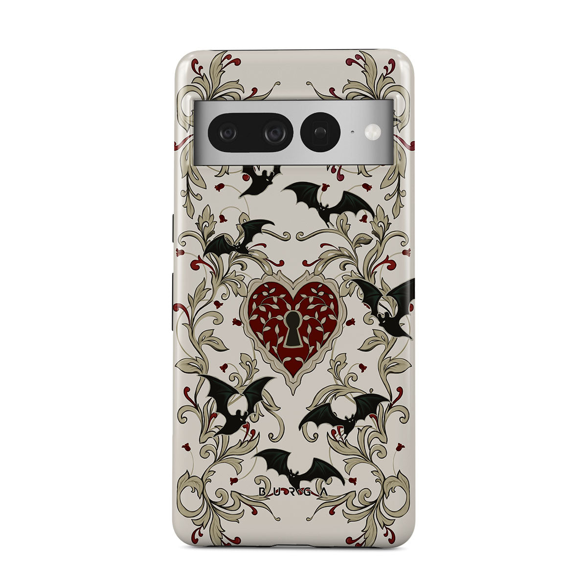 このデザインの特徴:ハート、鍵、コウモリ、ゴシック模様