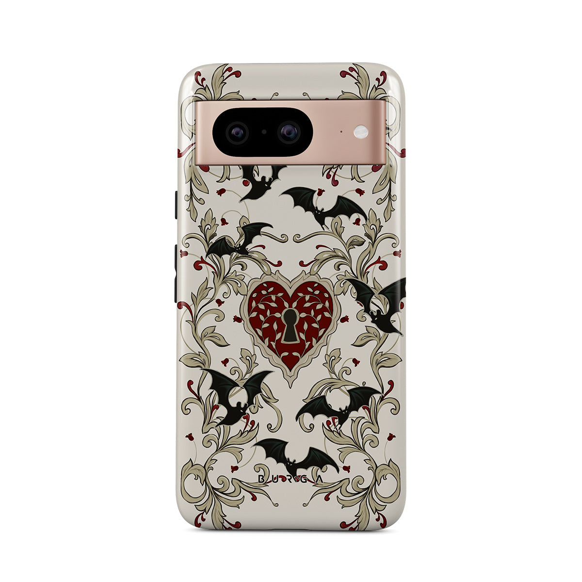 このデザインの特徴:ハート、鍵、コウモリ、ゴシック模様